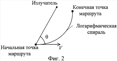 Новизна предложенного способа состоит в том, что наилучшая точность определения местоположения излучателя достигается за время, не превышающее отведенное. Отличие от прототипа заключается в том, что носитель пеленгатора перемещается не по прямой, а по логарифмической спирали с постоянным углом относительно направления на излучатель, величина которого вычисляется описанным выше способом.