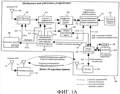 фиг.1А – структурная схема основных компонентов удаленной или мобильной приемной системы GPS, использующей способы согласно настоящему изобретению; показаны каналы передачи данных, которые могут существовать между базовой станцией и удаленным устройством;