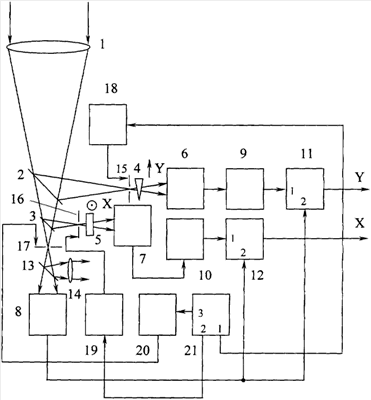 Решение поставленной задачи достигается тем, что в известном устройстве, содержащем фокусирующую приемную оптическую систему, два светоделителя, два фильтра, три фотоприемника, два усилителя, блок определения координаты Y, блок определения координаты X, фокусирующая приемная оптическая система, первый светоделитель, второй светоделитель и третий фотоприемник последовательно расположены на оптической оси, первый фильтр расположен на пути отраженного от первого светоделителя луча, второй фильтр расположен на пути отраженного от второго светоделителя луча, первый фотоприемник расположен на пути прошедшего через первый фильтр луча, выход первого фотоприемника соединен с входом первого усилителя, выход первого усилителя соединен с первым входом блока определения координаты Y, второй фотоприемник расположен на пути прошедшего через второй фильтр луча, выход второго фотоприемника соединен с входом второго усилителя, выход второго усилителя соединен с первым входом блока определения координаты X, выход третьего фотоприемника соединен с вторым входом блока определения координаты Y и вторым входом блока определения координаты X, градиент прозрачности первого фильтра параллелен оси Y, градиент прозрачности второго фильтра параллелен оси X, внесены следующие усовершенствования: оно дополнительно содержит третий светоделитель, окуляр, три диафрагмы, три привода диафрагмы, блок управления, первая диафрагма расположена в плоскости перетяжки луча между первым светоделителем и первым фильтром, вторая диафрагма расположена в плоскости перетяжки луча между вторым светоделителем и вторым фильтром, третья диафрагма расположена в плоскости перетяжки прошедшего через второй светоделитель луча, третий светоделитель расположен на пути прошедшего через третью диафрагму луча между третьей диафрагмой и третьим фотоприемником, первый выход блока управления соединен с входом первого привода диафрагмы, выход первого привода диафрагмы соединен с управляющим входом первой диафрагмы, второй выход блока управления соединен с входом второго привода диафрагмы, выход второго привода диафрагмы соединен с управляющим входом второй диафрагмы, третий выход блока управления соединен с входом третьего привода диафрагмы, выход третьего привода диафрагмы соединен с управляющим входом третьей диафрагмы, окуляр расположен на пути отраженного от третьего светоделителя луча.