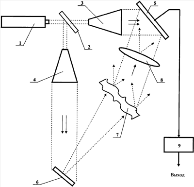 Прибор состоит из газового лазера 1 с непрерывным излучением, связанным со светоделительной пластиной 2, световые пучки от которой поступают соответственно на два коллиматора – коллиматор опорного канала 3 и коллиматор предметного канала 4. Плоская волна от коллиматора опорного канала воздействует на фоточувствительную матрицу 5, например прибор с зарядовой связью (ПЗС) с высокой разрешающей способностью, а плоская волна от коллиматора предметного канала облучает шифруемый документ 6, рассеянное излучение от которого через астигматическую среду 7, дополнительно рассеивающую предметную волну, и приемный объектив 8 также поступает на фотоприемную матрицу, образуя на последней голограмму, а элементы фотоприемной матрицы электрически связаны с построчно считывающим устройством 9, сигнал с выхода которого используется для закрытой связи или открытой связи, например, через Интернет.