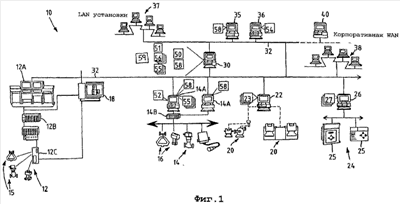 Обратимся к фиг.1, где типовая установка 10 для управления технологическим процессом включает в себя ряд систем для решения коммерческих задач и других компьютерных систем, соединенных с несколькими системами управления и технического обслуживания через одну или несколько систем. Показанная установка 10 для управления технологическим процессом также включает в себя одну или несколько систем 12 и 14 управления технологическим процессом. Система 12 управления технологическим процессом может представлять собой стандартную систему управления технологическим процессом, такую как система PROVOX или RS3 или любую другую распределенную систему управления (DCS). Система 12, показанная на фиг.1, включает в себя интерфейс 12А оператора, подсоединенный к контроллеру 12В и платам 12С ввода/вывода (I/O), которые в свою очередь соединены с различными полевыми устройствами, такими как аналоговые полевые устройства 15 типа HART (дистанционные первичные измерительные преобразователи с магистральной адресацией). Система 14 управления технологическим процессом, которая может представлять собой распределенную систему управления технологическим процессом, включает в себя один или несколько интерфейсов 14А оператора, подсоединенных к одному или нескольким распределенным контроллерам 14В через шину, такую как шина Ethernet. Контроллеры 14В могут являться, например, контроллерами DeltaVTM, поставляемыми фирмой Fisher Rosemount Systems, Inc. of Austin, Texas, или контроллерами любого другого требуемого типа. Контроллеры 14В подсоединены через устройства ввода-вывода к одному или нескольким полевым устройствам 16, таким как, например, полевые устройства HART или Fieldbus, либо любым другим интеллектуальным или не интеллектуальным полевым устройствам, в том числе, например, устройствам, которые используют любой из протоколов: PROFIBUS®, WORLDFIB®, DeviceNet®, AS Interface и CAN. Как известно, полевые устройства 16 могут предоставлять аналоговую или цифровую информацию контроллерам 14В, связанным с переменными технологического процесса, а также с другой информацией об устройстве. Интерфейсы 14А оператора могут хранить и выполнять инструменты, доступные оператору, управляющему технологическим процессом, для управления ходом технологического процесса, в том числе, например, оптимизаторы управления, экспертные диагностические программы, нейронные сети, средства настройки и т.д.