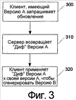 Фиг. 3 представляет собой блок-схему алгоритма другого иллюстративного способа сопровождения обновляемого файла. В этом примере сервер предоставляет клиенту последние изменения в виде файла различий («диф-файла»). На этапе 300 клиент, имеющий Версию А файла, запрашивает обновление файла. Клиент мог бы сделать такой запрос по той, например, причине, что клиенту желательно произвести изменения в самой последней версии файла. Клиент сообщает серверу о том, что на клиенте имеется Версия А, и в ответ на это сервер на этапе 310 посылает клиенту «диф» для А. Сервер мог сохранить «диф» для А после обновления, произведенного предыдущим клиентом (например, на этапе 260 на фиг. 2). На этапе 320 клиент применяет «диф» Версии А к сохраняемой им Версии А, чтобы сгенерировать самую последнюю версию файла (например, «Версию В»).