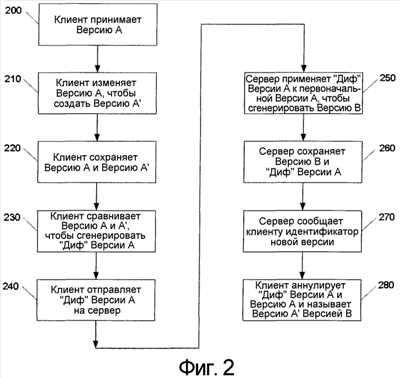 Фиг. 2 представляет собой блок-схему алгоритма иллюстративного способа сопровождения обновляемого файла согласно настоящему изобретению. В этом иллюстративном варианте осуществления изобретения клиент изменяет файл и пересылает изменения на сервер. На этапе 200 клиент принимает копию последней версии («Версии А») базового файла, который хранится на сервере. На этапе 210 клиент производит свои изменения в Версии А, чтобы создать Версию А’. На этапе 220 клиент сохраняет копию первоначальной Версии А и новой Версии А’. Таким образом, клиент сохраняет копию последнего известного состояния файла на сервере, даже если пользователь обновляет файл. Предполагается, что копия Версии А может быть сохранена у клиента либо до этапа 210, либо после этапа 210.