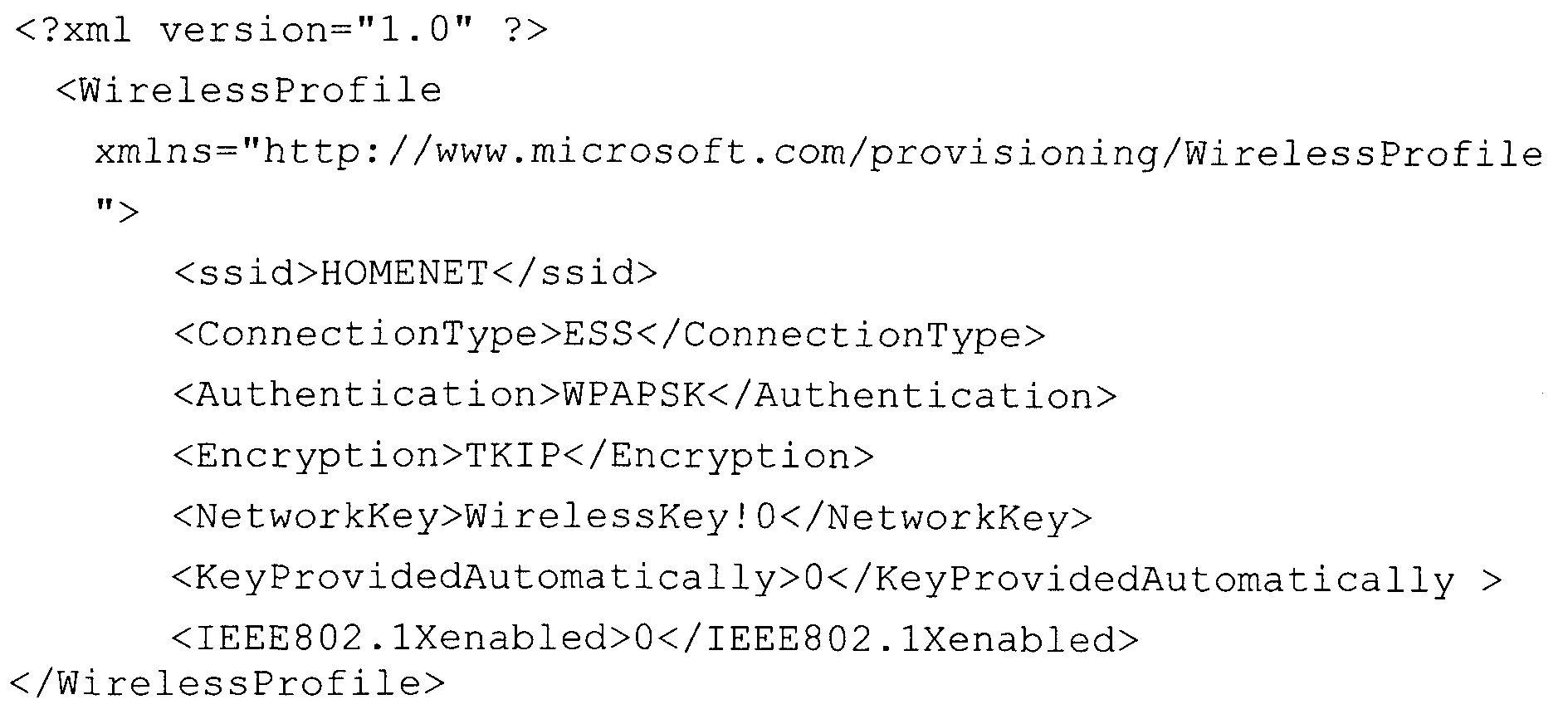 Примерный образец файла WSETTINGS.XML сформулирован ниже. Этот образец был сгенерирован, например, ПК, используя XML схему беспроводной конфигурации, сформулированной выше.