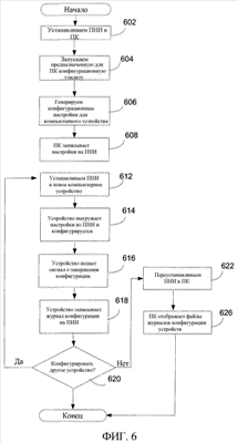 Способ использования переносного носителя информации для конфигурации устройства – тонкого клиента в соответствии с вариантом воплощения изобретения описан со ссылкой на фиг.6. Этот метод используется, например, тонким клиентом или «автономными» устройствами типа беспроводных принтеров, цифровых звуковых приемников и интеллектуальных дисплеев. Описанный способ упрощает процесс конфигурации для таких устройств по сравнению с предыдущими способами. Способ начинает с этапа 602 с подсоединения переносного носителя (ПНИ) информации, типа перепрограммируемого устройства USB, к персональному компьютеру, который используется для создания параметров настройки для устройства – тонкого клиента. Пользователь затем запускает предназначенный для PC инструментальное средство конфигурации на персональном компьютере на этапе 604. С помощью интерактивного процесса при помощи экранов интерфейса пользователя инструментальное средство конфигурации помогает пользователю создавать параметры настройки конфигурации для намеченного устройства – тонкого клиента на этапе 606. Параметры настройки конфигурации записываются на переносной носитель информации в виде одного или более XML файлов на этапе 608. Переносной носитель информации после этого извлекается из персонального компьютера и устанавливается в новое компьютерное устройство, которое будет конфигурироваться, на этапе 612. Компьютерное устройство загружает подходящие параметры настройки сетевой конфигурации из ПНИ и обеспечивается на этапе 614. Если компьютерное устройство поддерживает автоматический протокол обнаружения, типа UPnP, компьютер в сети немедленно распознает новое устройство и уведомляется относительно его наличия. В одном варианте воплощения загрузка выполняется автоматически без какого-либо вмешательства пользователя. Компьютерное устройство ищет XML файлы, сохраненные на переносном носителе информации, для специфических требуемых полей данных, и загружает соответствующие данные из переносного носителя информации. При этом способе устройство только читает данные, требующиеся для его работы. Устройство затем выполняет программу конфигурации для автоматической конфигурации самого себя, используя принятые данные настройки конфигурации.