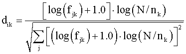 где fik является частотой встречаемости терма tk в документе Di; N является общим количеством документов в наборе; и nk является количеством документов, которые содержат терм tk.