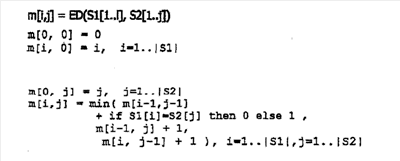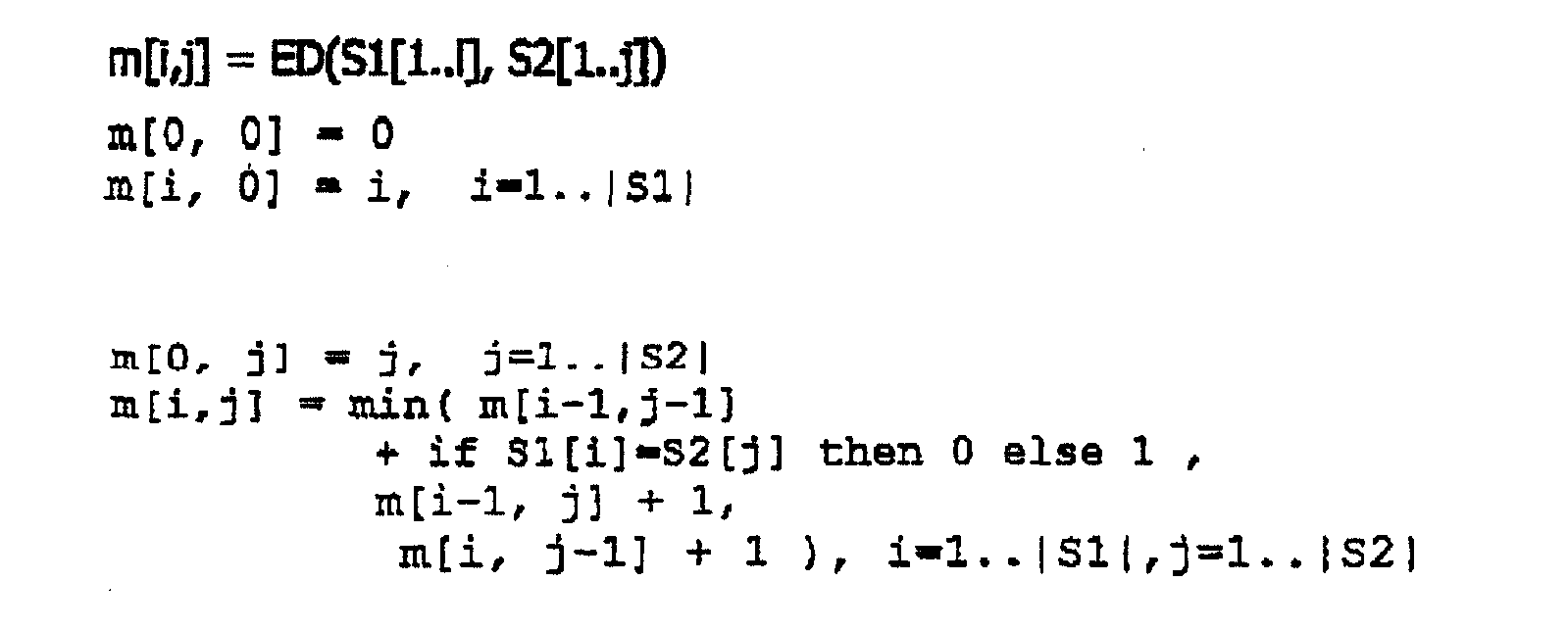 Для вычисления расстояния редактирования между двумя строками, в качестве иллюстрации, используется алгоритм динамического программирования. Для представления значений расстояния редактирования используется двумерная матрица, m[0..|S1|,0..|S2|]: