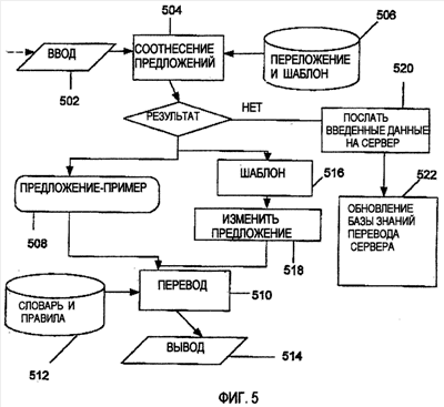 Согласно одному из аспектов настоящего изобретения Фиг.5 является блок-схемой алгоритма, иллюстрирующей полный процесс, причем пользователь начинает с ввода предложения, перевод которого он ищет. Блок 502 представляет процесс ввода данных пользователем, который может производиться через устройство речевого ввода, при помощи клавиатуры, через устройство рукописного ввода или другим способом. Блок 504 представляет процесс сравнения введенных данных с предложениями и шаблонами 506, хранящимися в клиенте в качестве части, зависящей от языка базы данных (и/или части любой специализированной базы данных).