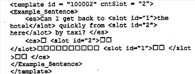 Согласно одному из аспектов настоящего изобретения описанный процесс перевода реализуется посредством основанного на шаблонах машинного перевода, как это показано на примере формата данных в Выражении 1: