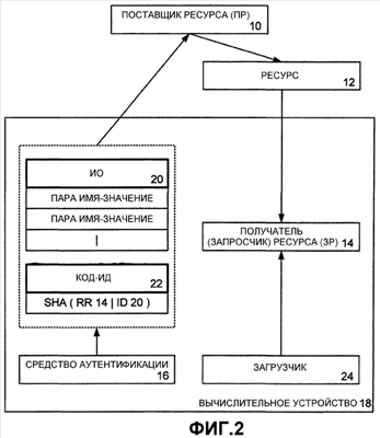 В одном варианте осуществления настоящего изобретения ресурс 12 имеет особенную ценность или должен быть обработан в соответствии с заранее определенными правилами, и соответственно ПР 10 только предоставляет его для ЗР 14, если ЗР 14 или связанное с ним средство 16 аутентификации представляет информацию аутентификации для ПР 10, и ПР 10 на ее основе выполняет аутентификацию (устанавливает подлинность) ЗР 14. Этот ЗР и средство 16 аутентификации могут, например, оба находиться на вычислительном устройстве 18 пользователя, при этом средство 16 аутентификации является средством оценки доверия или некоторым другим системным объектом в вычислительном устройстве 18, таким как загрузчик или другая часть операционной системы на вычислительном устройстве 18.