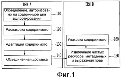 Фиг.1 – это схема, иллюстрирующая процесс обмена содержимым между разными DRM-клиентами согласно настоящему изобретению. Предполагается, что DRM-клиент A хочет экспортировать (передать) содержимое, а DRM-клиент B хочет импортировать (принять) его. Как показано на фиг.1, на этапе 110 проверяется, имеет ли содержимое авторизацию, чтобы быть экспортированным, ссылаясь на выражение прав, содержащееся в содержимом.
