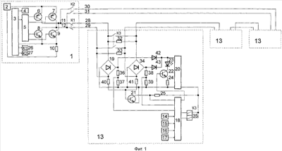 Для сохранения работоспособности системы в случае возникновения обрыва в двухпроводной линии связи выходные выводы последнего извещателя соединяются с выводами 30 и 31 пожарного приемно-контрольного прибора. Если в процессе цикла опроса извещателя микропроцессор 3 не обнаружил ни одной фазы с повышенным током потребления, он фиксирует наличие обрыва двухпроводной линии или отсутствие данного извещателя. Микропроцессор запоминает список ответивших извещателей и замыкает контакты реле 27. Теперь опрос состояния ранее ответивших извещателей происходит по цепям 28 и 29 двухпроводной линии, а опрос состояния не ответивших извещателей происходит по цепям 30 и 31. Таким образом осуществляется опрос всех извещателей, фиксируется место возникновения обрыва и сохраняется работоспособность всей системы при возникновении обрыва в двухпроводной линии связи.