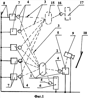 Цифровые видеокамеры 22 и контрольно-измерительные приборы, например датчик 23 снабжены реле 27, а вместе с сетевым компьютером 20 и сервером 21 подключены к силовой линии 8 (бытовой электросети). Реле 27 включают или отключают через сетевой компьютер 20, например, используя радиосигналы. В этом случае цифровой сигнал преобразуется в аналоговый, а затем в радиосигнал, воспринимаемый реле 27.