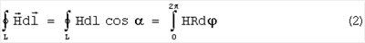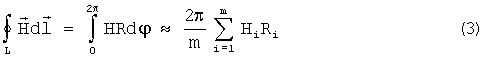 Из выражения (3) следует, что для определения циркуляции вектора по произвольному контуру L необходимо разбить интервал углов от 0 до 2 на m равных углов  из радиусов, исходящих из точки С (фиг.3). В каждой i-й точке контура L нужно измерить напряженность магнитного поля Hi, а также соответствующий радиус Ri, проведенный в i-ю точку из точки С. Вычислив сумму произведений HiRi, затем умножим на .
