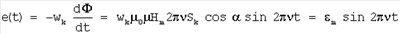При определении циркуляции вектора по формуле (3) необходимо знать в каждой точке величину напряженности магнитного поля. Она в произвольной точке прямоугольной системы координат 3 измеряется индукционным методом, в основе которого лежит переменное магнитное поле , где Hm – амплитуда и – частота поля. Для измерения напряженности магнитного поля в исследуемую точку поместим транспортир 9 вместе с измерительной катушкой 7, содержащей wk витков и имеющей столь малые размеры, что поле в ее окрестности можно описать однородным. Если измерительную катушку 7 расположить так, чтобы ось ее (нормаль ) совпала с указателем углового положения 12 и они были направлены в сторону бесконечно длинного проводника с током NI (фиг.7, с), то магнитный поток через измерительную катушку 7 изменит по гармоническому закону ,