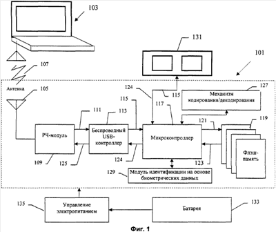Запоминающее устройство 101 может также включать модуль 129 идентификации на основе биометрических данных, составляющий одно целое с запоминающим устройством 101, как показано на Фиг.1. Модуль 129 идентификации на основе биометрических данных является спаренным с микроконтроллером 117 и управляется им. Доступ к твердотельной памяти 119 для чтения и записи данных предоставляется хосту 103 при условии, что модуль 129 идентификации на основе биометрических данных идентифицирует личность пользователя хоста 103. В противном случае пользователю будет отказано в доступе к твердотельной памяти 119. Модуль 129 идентификации может использоваться для защиты конфиденциальных данных, хранящихся на запоминающем устройстве 101. Он может также использоваться, чтобы запретить пользователю записывать на запоминающее устройство 101 материал, охраняемый авторским правом, без произведения оплаты. В одном варианте осуществления модуль 129 идентификации на основе биометрических данных включает датчик отпечатка большого пальца для получения данных отпечатка большого пальца пользователя. В качестве альтернативы могут использоваться другие биометрические данные. Биометрические данные могут храниться в модуле 129 идентификации на основе биометрических данных для сравнения их с полученными данными.