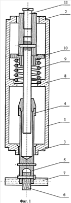 В сравнении с ближайшим аналогом металлоемкость заявляемой конструкции значительно меньше, т.к. в ней использованы в основном прямоугольные профили. Не требуется обточка и нарезка резьбы на токарном станке ряда деталей корпуса. В связи с тем, что рабочий ход упругого элемента незначительный, он выполнен более коротким. Однако длина всего устройства меняться не должна, поэтому корпус снабжен дополнительным фланцем – опорой упругого элемента при сохранении общей длины устройства. Это также приводит к снижению металлоемкости всей конструкции. Цилиндрические полые вставки, закрепленные в отверстиях коромысла, упрощают и уменьшают длительность технологического процесса закрепления и снятия пеналов с устройства. Выполнение нижней части тяги в виде вилки позволяет упростить саму конструкцию коромысла и использовать имеющийся конструкционный запас прочности тяги. При наличии вилки в тяге коромысло выполняется из одной детали, в то время как в ближайшем аналоге коромысло выполнено из двух пластин, закрепляемых по обе стороны от тяги. Для их объединения в одну конструкцию требуются дополнительные стяжные болты. Антикоррозионное покрытие деталей обеспечивает значительное увеличение сроков эксплуатации устройства без извлечения его для обследования. Кроме того, уменьшаются поступления продуктов окисления поверхностей металла от большого количества таких устройств, расположенных в хранилище.