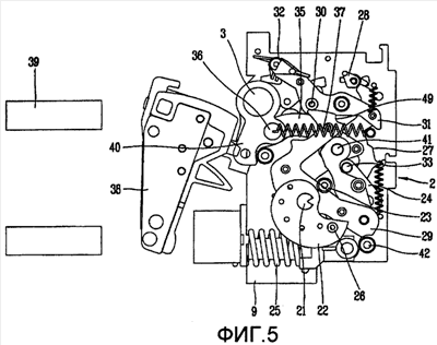 Во время размыкания воздушного автоматического выключателя упругая восстанавливающая сила натянутой открывающей пружины 37, при размыкании цепи, отделяет (отсоединяет) подвижный контакт 38 от вывода 39. Соответственно, подвижный контакт 38 возвращается в первоначальное положение, показанное на фиг.5.
