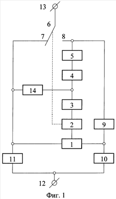 Таймер (фиг.1), включенный в систему оттайки холодильника, работает следующим образом. При подаче напряжения сети подвижный контакт 6 реле замкнут на первый неподвижный контакт 7. От второго полюса 13 источника питания ток через нормально замкнутые контакты 6-7 реле, счетчик времени 1 и датчик 10 окончания оттайки, контакты которого замыкаются после набора холода, поступает к первому полюсу 12 источника питания, обеспечивая работу счетчика времени 1, который начинает отсчитывать время работы компрессора 11, пропорциональное числу колебаний напряжения питающей сети (или внутреннего генератора тактовых импульсов). Одновременно начинает протекать ток по цепи второй полюс 13 источника питания, нормально замкнутые контакты 6-7 реле, ограничитель напряжения 14, цепь из последовательно соединенных выпрямителя 4 и гасящего элемента 5, неработающий нагреватель 9, замкнутые после набора холода контакты датчика 10 окончания оттайки, первый полюс 12 источника питания. Идет процесс установления выходного напряжения выпрямителя 4. Когда напряжение на конденсаторе фильтра выпрямителя 4 достигает уровня ограничителя напряжения 14, замыкается цепь порогового устройства 3; таймер подготовлен к срабатыванию реле. После отсчета заданного времени работы компрессора 11 и замыкания выхода счетчика 1 начинает протекать ток по цепи: второй полюс 13 источника питания, замкнутые подвижный 6 и первый неподвижный контакт 7 реле, счетчик времени 1, обмотка 2 реле, пороговый элемент 3, цепь из последовательно соединенных выпрямителя 4 и гасящего элемента 5, неработающий нагреватель 9, замкнутые контакты датчика 10 окончания оттайки, первый полюс 12 источника питания. Реле срабатывает, подвижный контакт 6 замыкается со вторым неподвижным контактом 8. Подается напряжение на нагреватель 9, начинается процесс оттайки. Питание обмотки 2 реле осуществляется по цепи: второй полюс 13 источника питания, замкнутые подвижный 6 и второй неподвижный контакт 8 реле, цепь из последовательно соединенных гасящего элемента 5 и выпрямителя 4, пороговое устройство 3, счетчик времени 1, неработающий компрессор 11, первый полюс 12 источника питания. Счетный вход счетчика времени 1 при этом закорочен последовательно соединенными датчиком 10 окончания оттайки и неработающим компрессором 11. Перерыв в работе счетчика времени 1 продолжается до окончания оттайки и размыкания контактов датчика оттайки 10. После этого ток от второго полюса 13 источника питания через замкнутые подвижный 6 и второй неподвижный контакт 8 реле, неработающий нагреватель 9, счетный вход счетчика времени 1, неработающий компрессор 11 поступает к первому полюсу 12 источника питания. Счетчик времени 1 отсчитывает время паузы после оттайки (паузы может и не быть). По окончании паузы счетчик времени 1 переходит в исходное состояние, размыкая цепь питания обмотки 2 реле; подвижный контакт 6 реле переключается на первый неподвижный контакт 7; цикл повторяется.