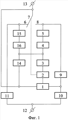 Ограничитель напряжения 18, используемый в этом варианте, может иметь в своем составе устройство преобразования диапазона выходного напряжения первого 4 и второго 16 выпрямителей в соответствии с требованиями, накладываемыми интегральной микросхемой счетчика времени 17 к уровням входных сигналов.