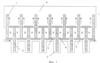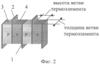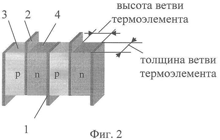 Конструкция термоэлектрической батареи приведена на фиг.1-2. ТЭБ состоит из последовательно соединенных в электрическую цепь посредством коммутационных пластин 1 и 2 чередующихся ветвей, изготовленных соответственно из полупроводника р-типа 3 и n-типа 4. Электрическое соединение ветвей осуществляют посредством контакта ветвь р-типа 3 – коммутационная пластина 1 или 2 – ветвь n-типа 4, где ветвь р-типа 3 контактирует торцевой поверхностью с одной из поверхностей коммутационной пластины, а ветвь n-типа 4 – с другой. Каждая ветвь в ТЭБ контактирует противоположными торцевыми поверхностями с двумя коммутационными пластинами 1 и 2. Коммутационные пластины 1 и 2 имеют площадь, несколько большую, чем площадь поперечного сечения ветвей р- и n-типа 3 и 4, вследствие чего их концы выступают за поверхность структуры, образованной ветвями ТЭБ. Концы нечетных коммутационных пластин 1 выступают за одну поверхность структуры, а концы четных коммутационных пластин 2 – за другую.