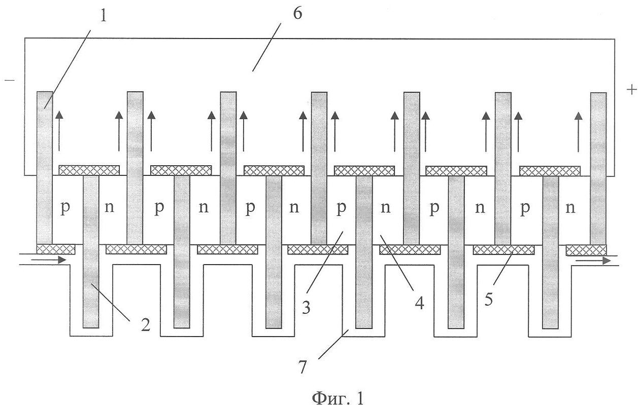 Поверхность структуры, образованной ветвями ТЭБ, за исключением областей близлежащих к выступающим частям коммутационных пластин 1 и 2, покрыта слоем теплоизоляционного диэлектрического материала 5. Площадь, не покрытая слоем теплоизоляционного диэлектрического материала 5, определяется произведением толщины ветви термоэлемента на 1/4 ее высоты. Съем теплоты с горячих коммутационных пластин, а также с близлежащих к ним областей, осуществляется за счет испарительного охлаждения, реализуемого испарительной системой 6. Съем теплоты («холода») с охлажденных коммутационных пластин и близлежащих к ним областей производится за счет прокачивания жидкости в контактирующем с ними жидкостном теплообменнике 7.