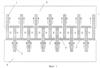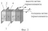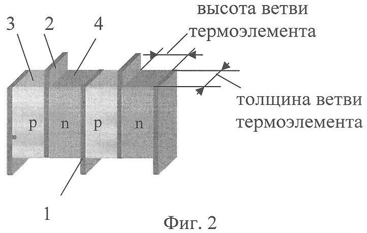Конструкция термоэлектрической батареи приведена на фиг.1-2. ТЭБ состоит из последовательно соединенных в электрическую цепь посредством коммутационных пластин 1 и 2 чередующихся ветвей, изготовленных соответственно из полупроводника p-типа 3 и n-типа 4. Электрическое соединение ветвей осуществляют посредством контакта ветвь p-типа 3 – коммутационная пластина 1 или 2 – ветвь n-типа 4, где ветвь p-типа 3 контактирует торцевой поверхностью с одной из поверхностей коммутационной пластины, а ветвь n-типа 4 – с другой. Каждая ветвь в ТЭБ контактирует противоположными торцевыми поверхностями с двумя коммутационными пластинами 1 и 2. Коммутационные пластины 1 и 2 имеют площадь, несколько большую, чем площадь поперечного сечения ветвей p- и n-типа 3 и 4, вследствие чего их концы выступают за поверхность структуры, образованной ветвями ТЭБ. Концы нечетных коммутационных пластин 1 выступают за одну поверхность структуры, а концы четных коммутационных пластин 2 – за другую.