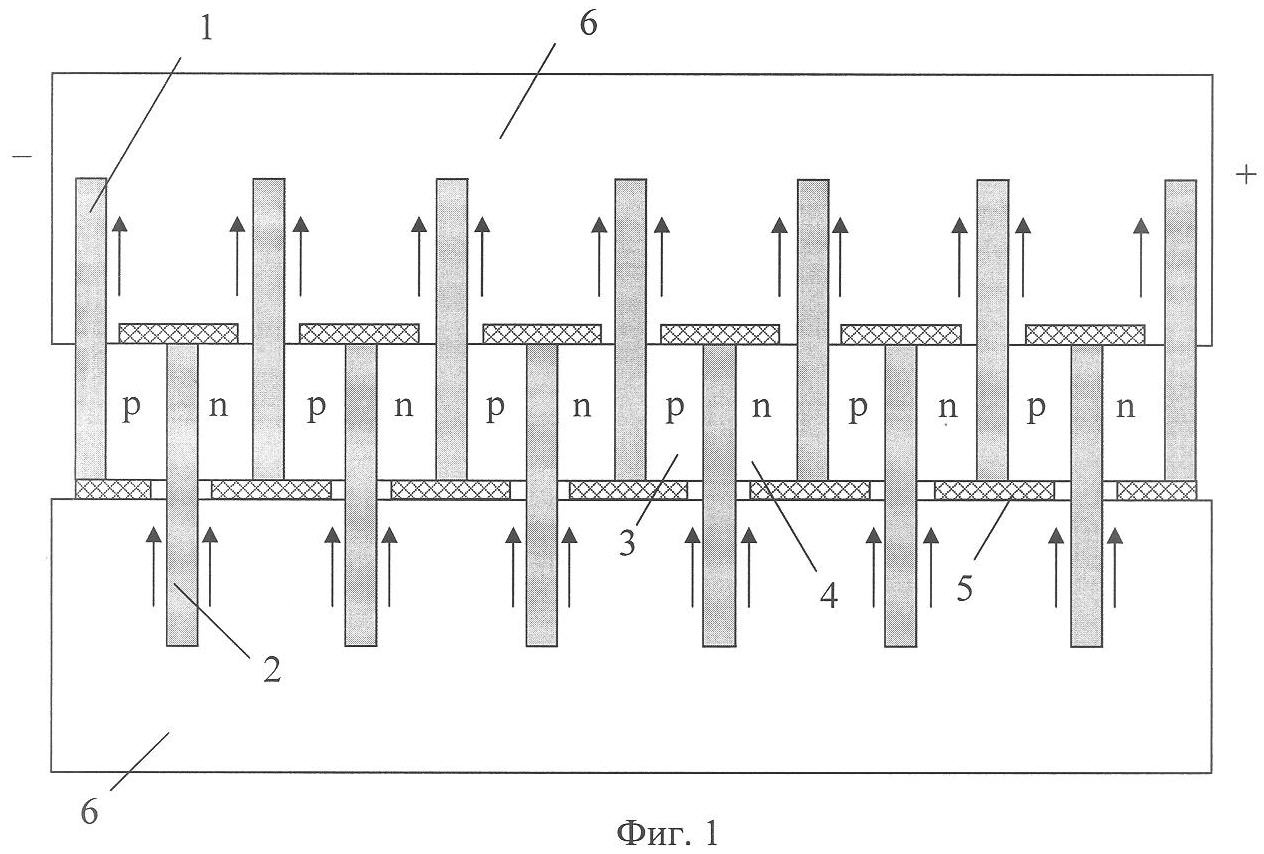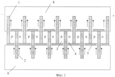Поверхность структуры, образованной ветвями ТЭБ, за исключением областей, близлежащих к выступающим частям коммутационных пластин 1 и 2, покрыта слоем теплоизоляционного диэлектрического материала 5. Площадь, не покрытая слоем теплоизоляционного диэлектрического материала 5, определяется произведением толщины ветви термоэлемента на ее высоты. Съем теплоты с коммутационных пластин, а также с близлежащих к ним областей осуществляется за счет испарения теплоносителя, реализуемого соответствующими испарительными системами 6.