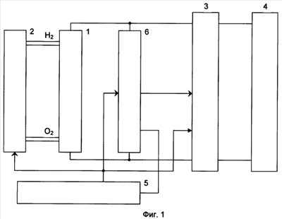1. Энергоустановка, содержащая электрохимический генератор, преобразователь напряжения, входы которого подключены к выводам электрохимического генератора, а выходы предназначены для подключения нагрузки, систему управления электрохимическим генератором и преобразователем напряжения, отличающаяся тем, что к выводам электрохимического генератора подключен блок диагностики, включающий подключенные к выводам электрохимического генератора датчик напряжения и цепь из последовательно соединенных управляемого ключевого элемента и датчика тока, и блок управления ключевым элементом, информационные входы которого соединены с выходами датчиков тока и напряжения, а выходы соединены соответственно с управляющим входом ключевого элемента и входом включения/отключения преобразователя напряжения, входы/выходы информационных сигналов блока управления ключевым элементом соединены с соответствующими выходами/входами информационных сигналов системы управления электрогенератором и преобразователем напряжения.