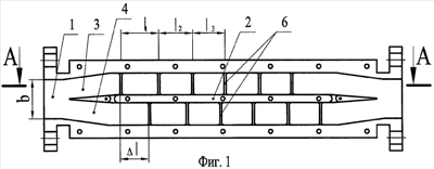 Эффективность подавления внеполосных и побочных колебаний, примыкающих к рабочей полосе частот, зависит от смещения L диафрагм 5 верхнего волновода 3 относительно диафрагм 5 нижнего волновода 4 и отклонения частоты внеполосных и побочных колебаний от рабочей полосы частот.