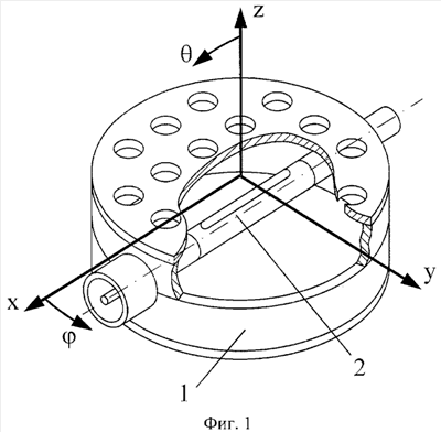 Начало декартовой и сферической систем координат на фиг.1 привязано к центру внешней стороны пластины 14.