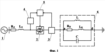 Сущность изобретения поясняется чертежами, где устройство (фиг.1) содержит генератор сети 1, тиристорный ключ 2, реле направления мощности 3, реле напряжения 4, блок управления 5 состоянием тиристорного ключа 2. Реле направления мощности включено входом к тиристорному ключу 2, а выходом, во-первых, к контуру 6, содержащему параллельно включенные индуктивность L и емкость С и эквивалентные параметры нагрузки RП и LП, образуя последовательную цепь: источник 1, тиристорный ключ 2, реле направления мощности 3 и нагрузка RП, LП, а во-вторых – к блоку управления 5.