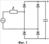 Известен и достаточно распространен способ «медленного» заряда ЕНЭЭ от источника переменного тока через вентильный выпрямитель, последовательно с которым включается токоограничивающий элемент, в качестве которого используются резисторы, катушки индуктивности, конденсаторы и индуктивно-емкостные двухполюсники [1, с.58 и др.], схема устройства для реализации которого приведена на фиг.3. При ограничении тока резистором КПД устройства повышается до 0,57 [1, с.219], однако этот коэффициент имеет более низкое значение по сравнению с зарядными цепями с реактивными токоограничивающими элементами. Это связано с наличием больших потерь энергии в резисторах. Поэтому при использовании реактивных токоограничивающих элементов этот способ может обеспечить более высокий КПД, так как избыток энергии источника, который гасится в резисторе (и тем снижает КПД), в реактивном элементе запасается в одном полупериоде изменения напряжения источника питания и возвращается в него в другом. Это повышает эффективность данного способа заряда ЕНЭЭ, поэтому он является энергосберегающим [1].