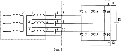 Выводы начальных витков обмоток ТИПТ в виде первой (1), второй (2) и третьей (3) фазных обмоток трехфазного источника переменного тока через токоограничивающедозирующие конденсаторы подключены соответственно к первому (8), второму (9) и третьему (10) входным выводам трехфазного мостового выпрямителя, при этом выводы концов первой (1′), второй (2′) и третьей (3′) фазных обмоток подключены соответственно к третьему (10), первому (8) и второму (9) входным выводам выпрямителя (7).