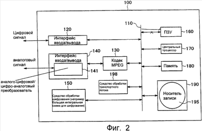 Процесс шифрования на этапе S562 является процессом шифрования AES, выполняемым с ключом К2 записи с использованием ключа Ks сеанса с целью генерирования ключа eKs (К2) записи. Как указывалось выше, ключ К2 записи является ключом, генерированным на этапе S555. С другой стороны, процесс шифрования на этапе S563 является процессом шифрования, выполняемым с расшифрованным пакетом 604 транспортного потока с использованием ключа Ks сеанса. Как указывалось выше, расшифрованный пакет 604 транспортного потока является результатом процесса расшифровки, выполненного на этапе S558 с использованием блочного ключа Kb1. Следует отметить, что в процессе шифрования на этапе S563 объектом шифрования может быть весь пакет 604 транспортного потока, часть пакета 604, только начальное число (начальное число 2) или что-то другое. Дополнительно к этому, тип обработки можно определять в соответствии со схемой хранения информации, включенной в пакет транспортного потока в качестве конфиденциальной информации, т.е. в соответствии с областью, зашифрованной с использованием блочного ключа Kb1. Эти схемы хранения были описаны ранее со ссылками на фиг.13-15.