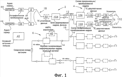 На фиг.1 показана система со сквозной передачей данных, предназначенная для широковещательной передачи аудио- и стереосигналов по множеству каналов связи с высоким качеством, к индивидуальным пассажирским сиденьям общественного транспортного средства при помощи многоабонентской сети 16 связи, также называемой двухпроводной шиной. Система содержит кодер 2 аудиоданных, декодер 4 аудиоданных и ретранслятор 6 данных. Кодер 2 выполняет (при необходимости) аналого-цифровое преобразование (АЦП, ADC) сигналов и формирует информационные кадры. Один канал связи RS-485 допускает одновременную передачу с использованием до пяти неуплотненных или до десяти уплотненных стереоканалов. Декодер 4 аудиоданных может быть встроен в подлокотник сиденья (не показано) пользователя. Дополнительные декодеры 4 могут быть соединены с сетью 16 для обслуживания большего числа пассажиров, при этом каждый пассажир имеет возможность выбрать аудиоканал для прослушивания в развлекательных целях. Ретранслятор 6 данных служит для восстановления, фильтрации и повторной передачи сигналов RS-485 в другой сегмент многоабонентской сети последовательной передачи данных, например, при необходимости, в следующий вагон состава (не показан).