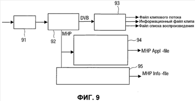 На фиг.9 показана обработка потока данных для выделения сообщений и информации о сообщениях. В блоке 91 выбора программ пакеты TS из выбранной программы поступают в демультиплексор 92, в то время как другие потоки TS удаляются, в результате чего создается частичный поток TS. Затем демультиплексор 92 отделяет пакеты MPEG TS из программы (DVB) от пакетов MHP TS, в результате чего обеспечивается подача данных DVB в блок 93 обработки видео, имеющий функции для извлечения файла клипового потока, клипового информационного файла и файла PlayList, как было описано выше в связи с фиг.4. Демультиплексор 92, кроме того, подает данные MHP в блок 94 сообщений для выделения сообщений из потока данных, причем эти сообщения содержат прикладные информационные объекты, и в блок 95 синтаксического анализа для создания прикладной управляющей информации. В блоке синтаксического анализа пакеты MHP подвергаются синтаксическому анализу для сбора соответствующей информации в дескрипторах SI. Средства 20 управления скомпонованы для запоминания сообщений в файле сообщений, называемом прикладной файл MHP (отдельно от информации в реальном времени в виде последовательности сообщений для программы), и для запоминания прикладной управляющей информации в информационном файле сообщений, называемом информационным файлом MHP. Прикладная управляющая информация включает в себя информацию доступа для доступа к сообщениям в файле сообщений, как подробно описывается ниже. Эти функции имеются в форматере 28 и/или в блоке 20 управления, как было описано в связи с фиг.2.