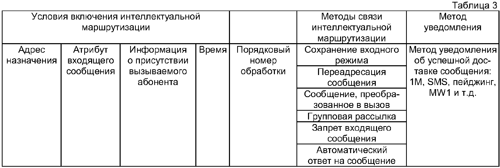 Для использования услуг интеллектуальной маршрутизации унифицированных сообщений абонент-адресат должен заранее настроить условия включения интеллектуальной маршрутизации и методы связи интеллектуальной маршрутизации, соответствующие условиям включения интеллектуальной маршрутизации. В общем случае условия включения интеллектуальной маршрутизации и методы связи интеллектуальной маршрутизации могут быть оформлены в виде спецификации, называемой спецификацией услуги интеллектуальной маршрутизации унифицированных сообщений. Поскольку роль атрибута вызываемого абонента может играть номер вызываемого абонента или номер группы пользователей, к которой он принадлежит (например, номер группы Centrex или номер группы перехвата), на практике существует несколько спецификаций услуги интеллектуальной маршрутизации вызова, например, спецификация услуги интеллектуальной маршрутизации унифицированных сообщений для пользователя, спецификация услуги интеллектуальной маршрутизации унифицированных сообщений для группы Centrex и спецификация услуги интеллектуальной маршрутизации унифицированных сообщений для группы перехвата. В таблицах 3 и 4, приведенных ниже, показаны примеры спецификации услуги интеллектуальной маршрутизации унифицированных сообщений для пользователя и для группы Centrex соответственно (в обе приведенные спецификации не включены все возможные поля, и показанный формат не является единственно возможным для таких спецификаций).