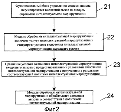 включение модулем обработки интеллектуальной маршрутизации услуги интеллектуальной маршрутизации, получение соответствующей информации о входящем вызове и формирование по меньшей мере одного условия включения интеллектуальной маршрутизации входящего вызова с соответствующей информацией;