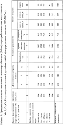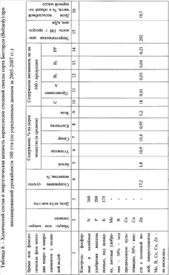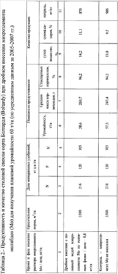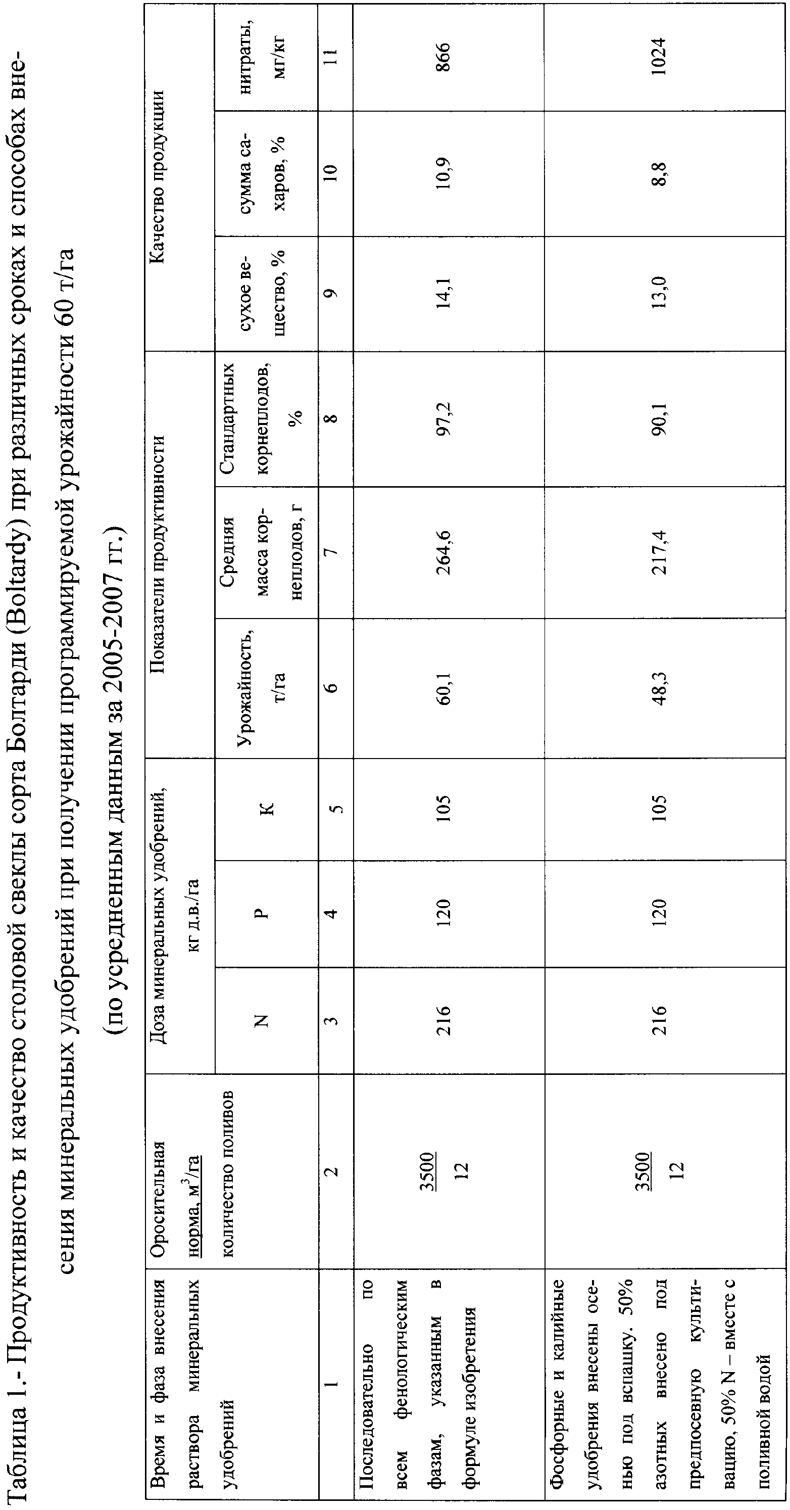 где hmin – минимальный шаг автопрореживания, мм; b – длина одного ножа, мм. Кроме того, перед прореживанием осуществляют прикатывание плантации со всходами гладкими катками в дневное время при снижении тургесценции в клетках растений (RU, патент К недостаткам описанного способа применительно к решаемой нами проблеме – повышение питательной ценности столовых сортов свеклы – относятся, несмотря на нормированное количество растений свеклы в рядке, большое количество вносимых удобрений, низкая урожайность, ограниченный срок хранения корнеплодов. Известен также способ выращивания корнеплодных культур в контролируемых условиях и установка для его осуществления, в котором выращивание корнеплодных культур осуществляют в контролируемых условиях путем высева семян в культивационные сосуды, размещенные на вертикальной поверхности, при этом в качестве культивационных сосудов используют мешочки, выполненные из биологически инертного пористого материала (см. RU, патент N 2040152 С1, МПК6 A01G 31/00. Способ выращивания корнеплодных культур в контролируемых условиях и установка для его осуществления / А.С.Зубян (RU). – Заявка 5059351/13; заявлено 20.08.1992; опубл. 25.07.1995). К недостаткам описанного способа выращивания корнеплодных культур в контролируемых условиях относится ограниченная область применения исключительно в исследовательских целях. Кроме описанных технологий известен способ возделывания сахарной свеклы, включающий подготовку поля под посев и посев, в котором высев семян проводят по 6 строк с расстоянием между ними в 0,20 м и междурядьем 0,80 м на глубину 2 К недостаткам описанного способа относятся низкая эффективность борьбы с сорной растительностью. Присыпание защитных зон вдоль рядков в системе орошаемого земледелия малоэффективно. Заслуживает внимания способ возделывания свеклы, включающий обработку семян фурадином и посев, в котором обрабатывают фурадином часть нормы высева семян и посев обработанных семян осуществляют на глубину 3 К недостаткам описанного способа применительно к решаемой нами проблеме – возделывание столовых сортов свеклы в условиях орошения – недопустимость препарата фурадина, т.к. он накапливается в корнеплоде даже при очень низких дозах внесения и влияет на трофические цепи питания человека (яд 1-го класса опасности). Определенный интерес у специалистов вызывает способ возделывания сахарной свеклы, включающий предпосевную обработку почвы, рядковый посев и обработку почвы до всходов свеклы, в котором посев проводят по четырехрядной схеме с комбинированной шириной междурядий 20×40×20 см и технологической колеей 1,40 м (RU, патент Описанная схема высева семян столовых сортов свеклы приемлема при возделывании в условиях орошения дождеванием. Полив можно осуществлять всеми видами дождевальных машин фронтального перемещения. Известен способ защиты растений сахарной свеклы от болезней, включающий обработку последних биологически активным веществом, в котором в качестве биологически активного вещества используют препарат СИЛК, представляющий собой сумму тритерпеновых кислот формулы С30Н46-48O4, выделенную из зелени пихты, в дозе 1,0-2,0 г/га по активному веществу, а обработку вегетирующих растений проводят два-три раза, начиная с фазы появления 8-10 листьев раствором с концентрацией 50-100 мг/л; (RU, патент на изобре