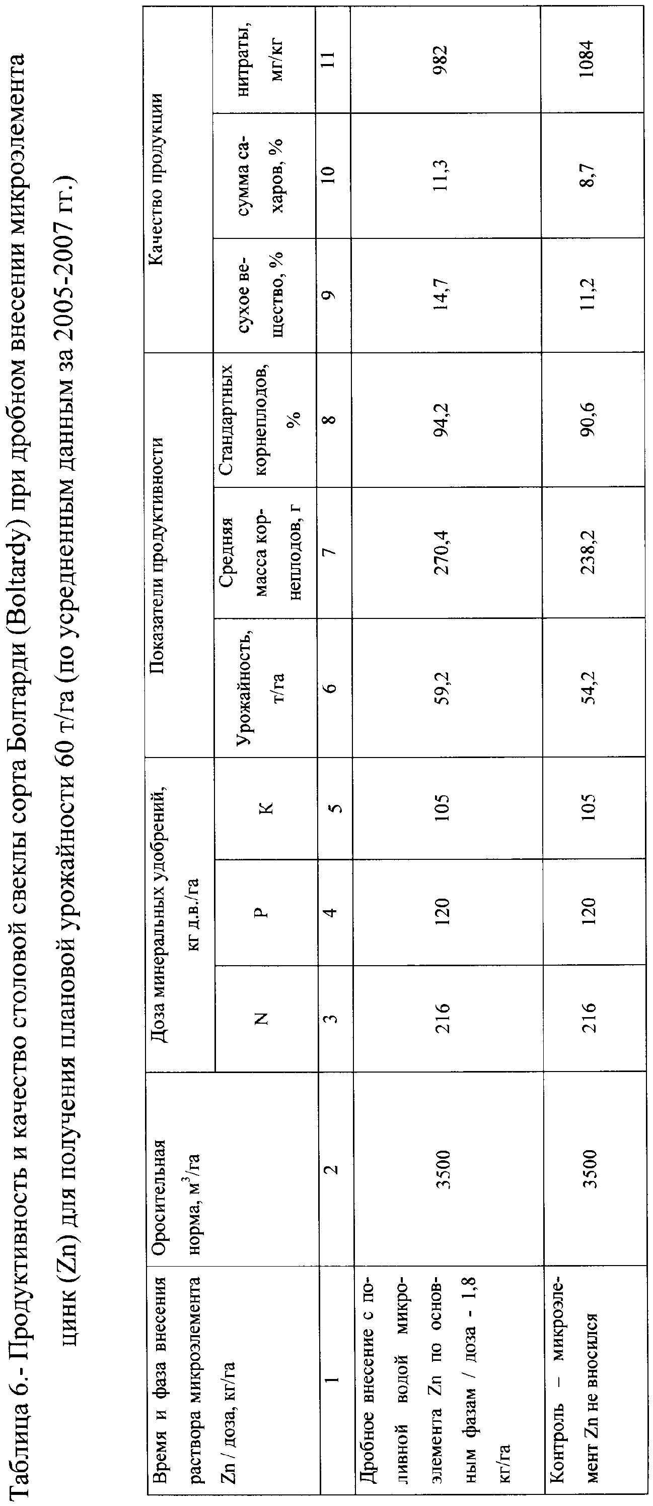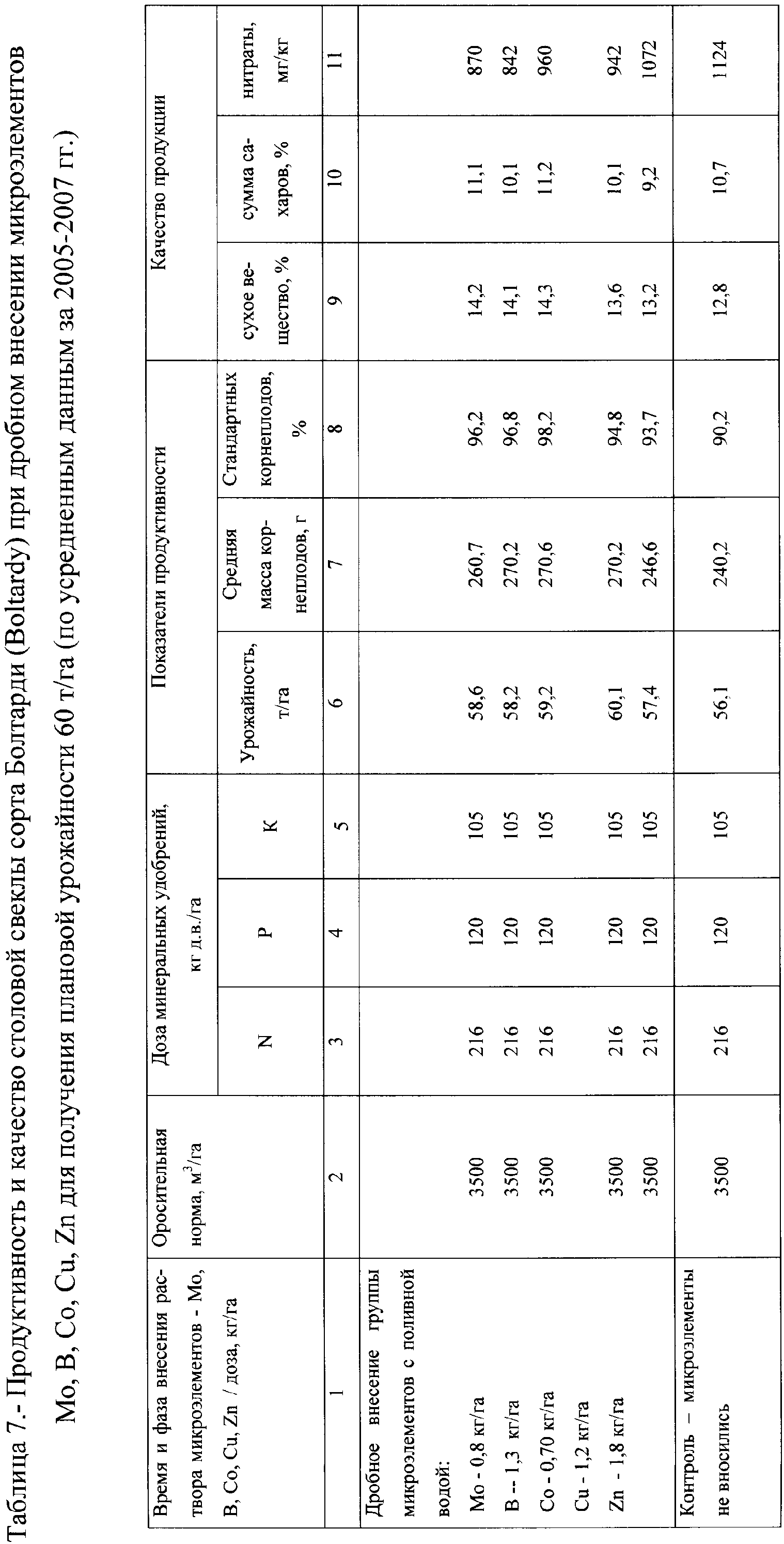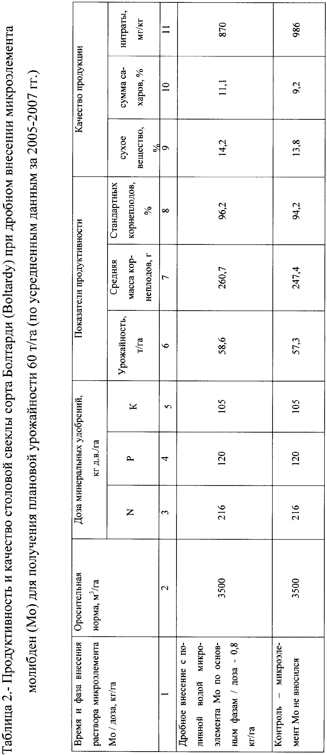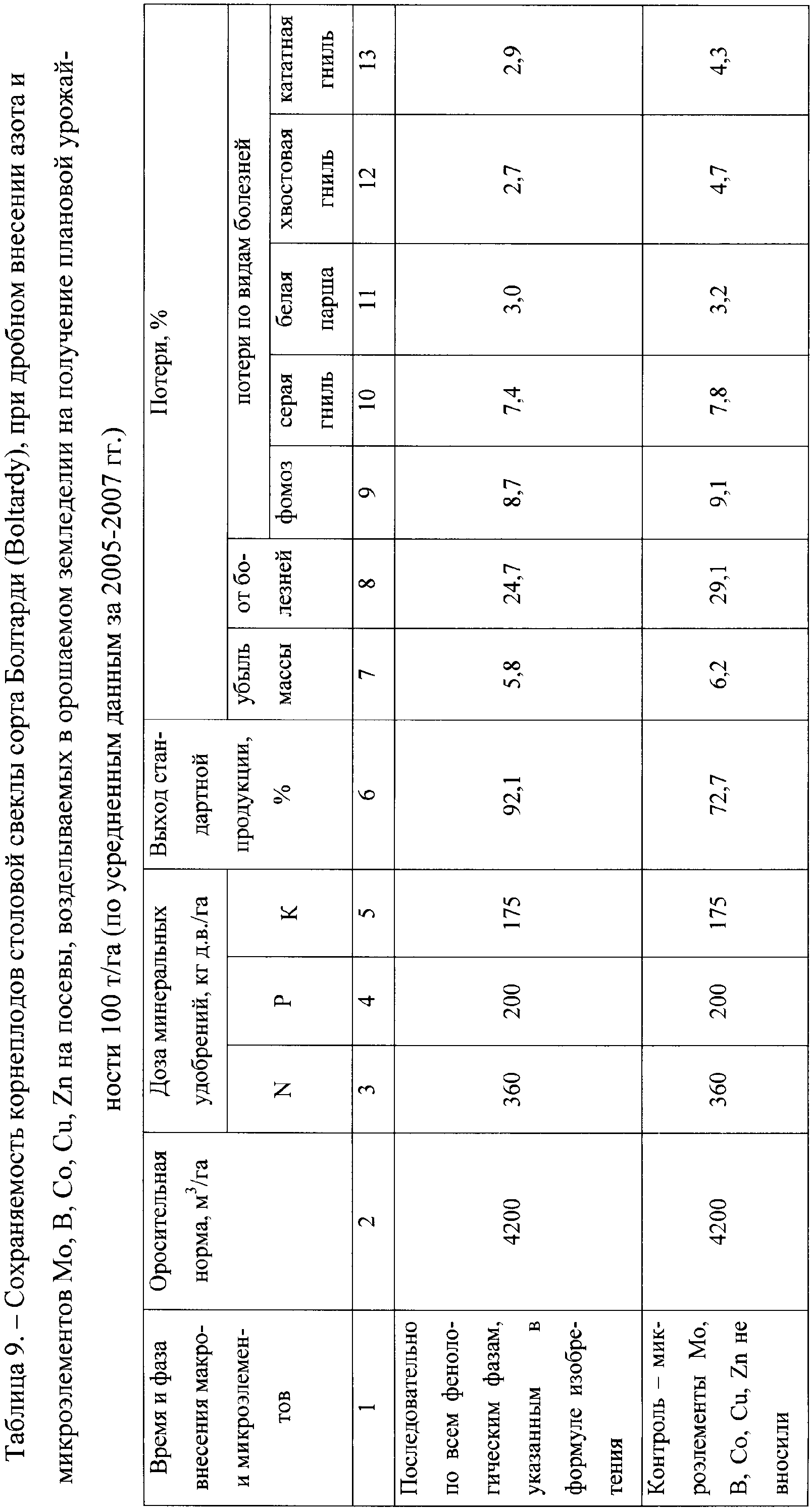 Способ возделывания столовых сортов свеклы в орошаемом земледелии, включающий лущение стерни предшественника, обработку почвы гербицидом, вспашку с оборотом пласта, ранневесеннее рыхление почвы и выравнивание, внесение в верхний слой почвы 0-0,1 м фосфора и калия, предпосевные поливы и культивацию на глубину 3-5 см, сев, прикатывание почвы до и после посева, боронование всходов, орошение в период вегетации, букетировку, защиту растений от сельскохозяйственных вредителей и болезней, междурядные рыхления и подкормку, при этом для получения урожайности 40, 60, 80 и 100 т/га азот и микроэлементы: молибден, бор, кобальт, медь и цинк вносят дробно с поливной водой по основным фенологическим фазам: азот дробно с поливной водой в фазе полных всходов, в фазах двух, пяти и семи настоящих листьев и фазе технической спелости в долях соответственно 20-22,5%, 30-32,5%, 35-37,5% и 7,5-15%; молибден – нормами 0,5; 0,8; 1,1 и 1,4 кг/га в указанных фазах долями соответственно 20-40%; 12-17%; 23-28% и 15-45%; бор – нормами 0,9; 1,3; 1,7; 2,1 кг/га в указанных фазах долями 40-50%, 15-20%, 23-42%, 3-7%; кобальт – нормами 0,35; 0,70; 1,05 и 1,40 кг/га в указанных фазах долями 30-40%, 10-15%, 23-30%, 15-37%, медь – нормами 0,6; 1,2; 1,8 и 2,4 кг/га, долями 15-17%, 30-42%, 15-17%, 24-40%, цинк – нормами 1,5; 1,8; 2,1 и 2,4 кг/га в указанных фазах долями 8-12%, 16-22%, 30-42%, 24-46%, при этом полив осуществляют оросительной нормой 3500-4200 м3/га, в фазах двух, пяти и семи настоящих листьев орошение ведут поливными нормами 700-900 м3/га, в фазе формирования корнеплода – поливной нормой 1200-1900 м3/га, в фазе технической спелости плода – нормой 1400-1600 м3/га.