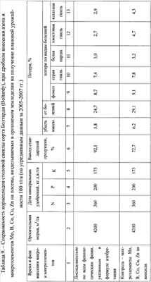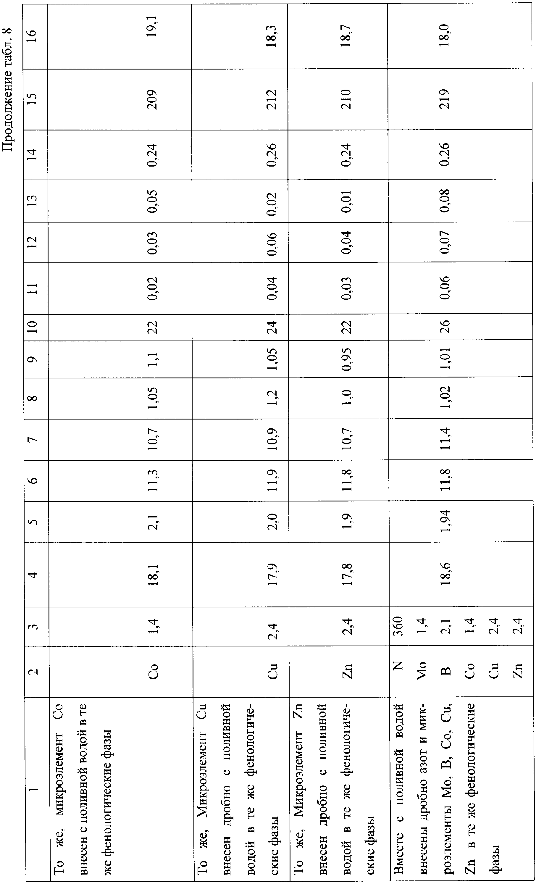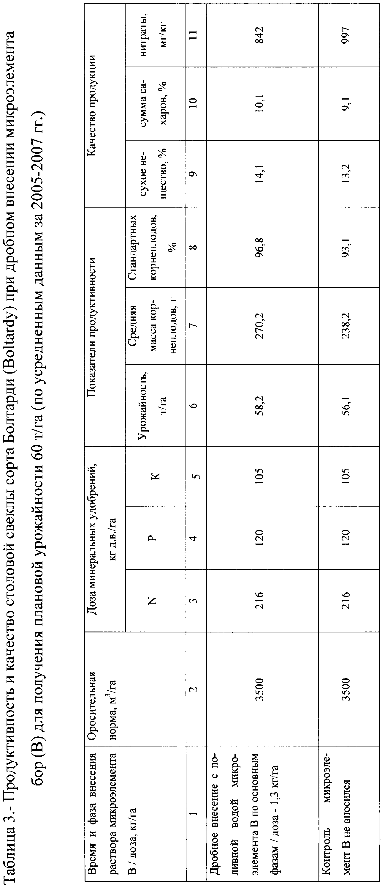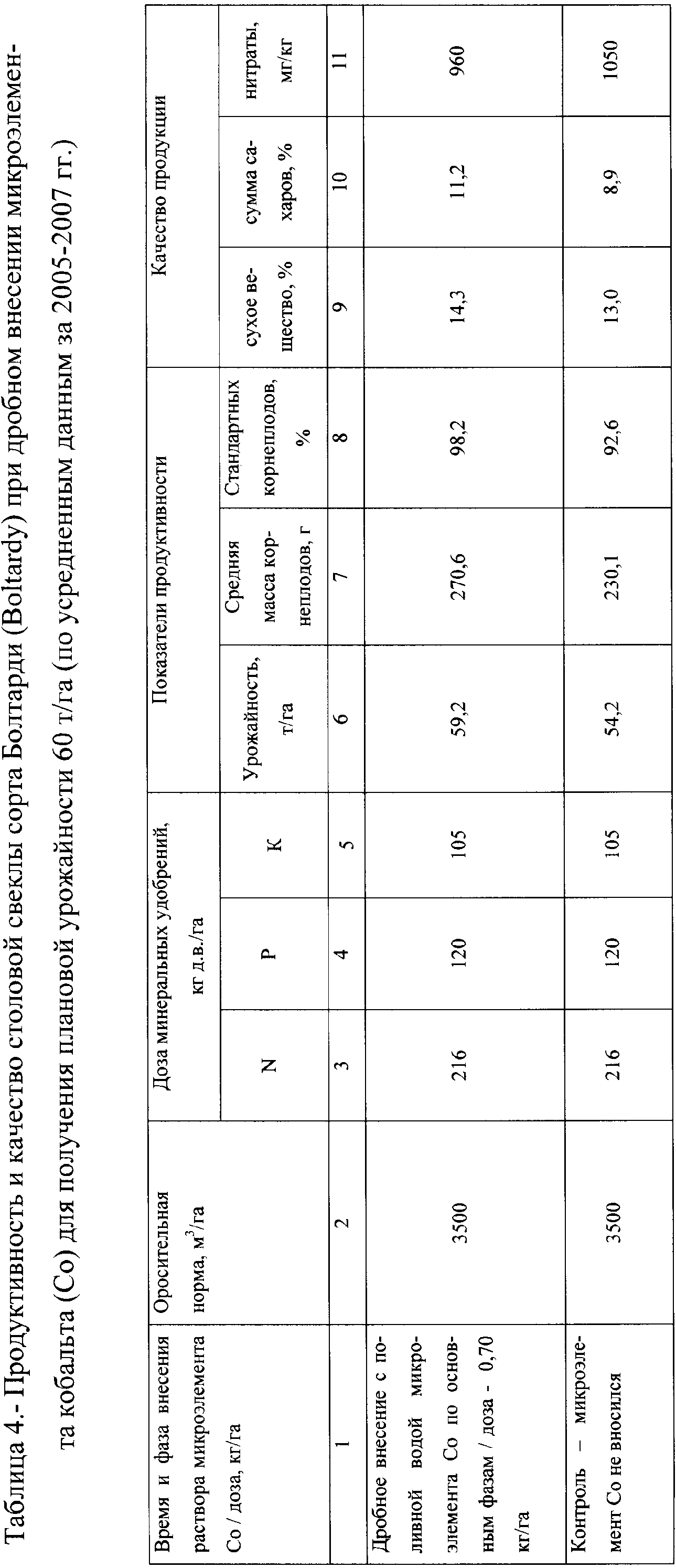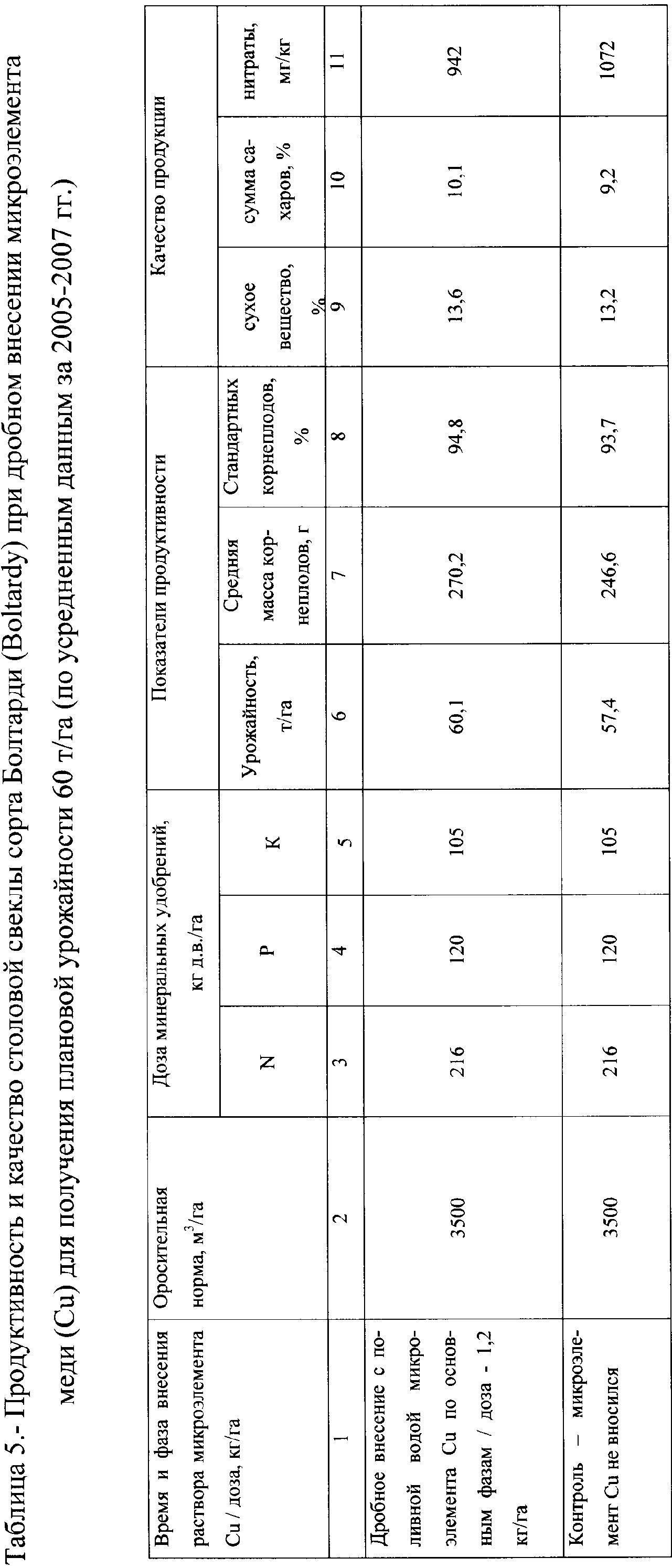Способ возделывания столовых сортов свеклы в орошаемом земледелии, включающий лущение стерни предшественника, обработку почвы гербицидом, вспашку с оборотом пласта, ранневесеннее рыхление почвы и выравнивание, внесение в верхний слой почвы 0-0,1 м фосфора и калия, предпосевные поливы и культивацию на глубину 3-5 см, сев, прикатывание почвы до и после посева, боронование всходов, орошение в период вегетации, букетировку, защиту растений от сельскохозяйственных вредителей и болезней, междурядные рыхления и подкормку, при этом для получения урожайности 40, 60, 80 и 100 т/га азот и микроэлементы: молибден, бор, кобальт, медь и цинк вносят дробно с поливной водой по основным фенологическим фазам: азот дробно с поливной водой в фазе полных всходов, в фазах двух, пяти и семи настоящих листьев и фазе технической спелости в долях соответственно 20-22,5%, 30-32,5%, 35-37,5% и 7,5-15%; молибден – нормами 0,5; 0,8; 1,1 и 1,4 кг/га в указанных фазах долями соответственно 20-40%; 12-17%; 23-28% и 15-45%; бор – нормами 0,9; 1,3; 1,7; 2,1 кг/га в указанных фазах долями 40-50%, 15-20%, 23-42%, 3-7%; кобальт – нормами 0,35; 0,70; 1,05 и 1,40 кг/га в указанных фазах долями 30-40%, 10-15%, 23-30%, 15-37%, медь – нормами 0,6; 1,2; 1,8 и 2,4 кг/га, долями 15-17%, 30-42%, 15-17%, 24-40%, цинк – нормами 1,5; 1,8; 2,1 и 2,4 кг/га в указанных фазах долями 8-12%, 16-22%, 30-42%, 24-46%, при этом полив осуществляют оросительной нормой 3500-4200 м3/га, в фазах двух, пяти и семи настоящих листьев орошение ведут поливными нормами 700-900 м3/га, в фазе формирования корнеплода – поливной нормой 1200-1900 м3/га, в фазе технической спелости плода – нормой 1400-1600 м3/га.