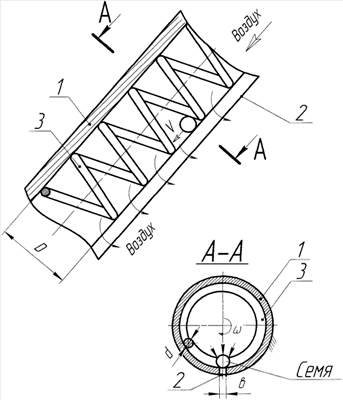 Семена из дозирующего устройства пневматической сеялки поштучно, с потоком воздуха подаются в трубопровод 1. Воздух при выходе через продольную щель 2 трубопровода 1 прижимает семена к ней. Пружинный шнек 3, размещенный внутри трубопровода 1, приводится во вращение от опорно-приводных колес пневматической сеялки через механизм передач (не показаны), и витками с постоянной скоростью перемещает семя вдоль щели 2 по трубопроводу 1 к сбросному отверстию. Причем низкие фрикционные свойства трубопровода 1 и витков шнека 3 уменьшают вероятность повреждения семян и способствуют свободному скольжению семени вдоль сквозной щели 2.