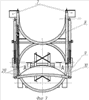 На осях рамы 1 (фиг. 1, 2, 3) установлены четыре колеса опорных 2. К раме приварено устройство навесное 3. В кольца рамы помещен бункер 4, имеющий невысокую цилиндрическую, коническую части и сужающееся выгрузное окно. К лонжеронам рамы приварены лоток 5, дуги направляющие 6, опоры 7 со штырями опор 24, дуга упорная 8 и рамка опорная 19 со штырями рамки 20. На цапфах рамы шарнирно установлены кулисы 9, к которым шарнирно присоединен захват 10 с прикрепленной дорожкой 11. Под бункером имеется устройство дозирующее 12, приводимое в движение приводом устройства дозирующего 13. Под устройством дозирующим расположен рассекатель 14, направляющий поток сыпучего материала на два диска разбрасывающих 16, огражденных впереди и сбоков щитками 15. Рабочие органы получают движение от вала отбора мощности трактора через механизм привода 17. Для транспортировки тракторного прицепа с удобрениями в пределах поля к раме приварен крюк 18, а для предотвращения смещения машины при загрузке материала из транспортного средства – упор 21. Кулисы приводятся в движение цилиндрами гидравлическими 22. На правой дуге направляющей (по ходу трактора) установлен ползун 23, закрепляемый фиксаторами 25, с которым шарнирно соединена стойка 27 с роликом 28 на конце. Стойка соединена с ползуном также пружиной 26. На малое кольцо рамы через уголки опираются два крестообразных ножа 29 (фиг.3, 4). К плите центральной тяги навесной системы трактора прикреплен кронштейн 30 (фиг.5, 6), на дуге которого размещены иглы 31.