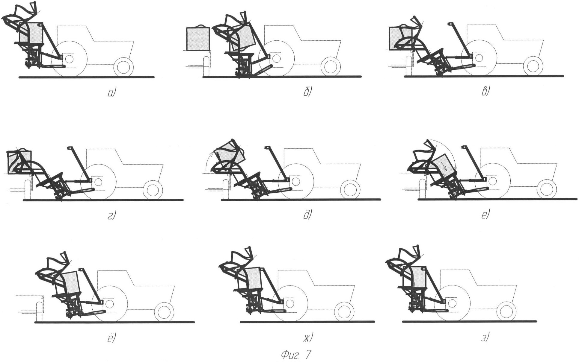 После рассева удобрений из очередной упаковки механизатор подъезжает к транспортному средству, опускает машину на землю (фиг.7а, 7б) и вручную снимает опорожненную упаковку с игл. Затем он гидроцилиндром, установленным вместо центральной тяги навесной системы, наклоняет машину назад (по ходу трактора) до касания участком ее рамы платформы транспортного средства, а упором – края платформы (фиг.7в). С помощью цилиндров гидравлических механизатор сначала переводит кулисы из переднего в заднее положение. При этом ролик, пробегая по дорожке, задает траекторию движения захвата, который в конце траектории круто опускается, захватывая материал (фиг.7г). После этого механизатор переводит кулисы в переднее положение, опрокидывая материал в лоток (фиг.7д, 7е). Ролик, находясь в углублении дорожки, не может по ней перемещаться, поэтому стойка отклоняется вперед, растягивая пружину до момента выхода ролика из углубления. Если материал в транспортном средстве расположен не на краю, его можно подвинуть, используя цепь с крючками и зацепляя ее за отверстия «Д» (фиг.2). При этом нужно переместить необходимое количество раз кулисы вперед-назад, каждый раз укорачивая цепь, до упора упаковки в дугу упорную.