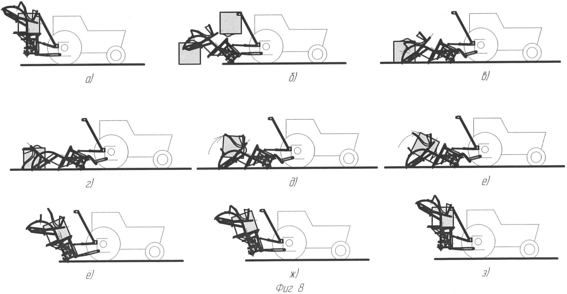 При загрузке с земли механизатор подъезжает к новому материалу, опускает машину на землю (фиг.8а, 8б) и вручную снимает опорожненную упаковку с игл. Затем он гидроцилиндром, установленным вместо центральной тяги навесной системы, наклоняет машину назад (по ходу трактора) до врезания штырей рамки опорной и штырей опор в землю (фиг.8в). При этом удлинители тяг навесной системы трактора поворачиваются относительно тяг. Дальнейший ход загрузки с земли (фиг.8г, 8д, 8е, 8е, 8ж, 8ж) не отличается от загрузки с платформы транспортного средства за исключением возврата удлинителей тяг в исходное положение (фиг.8е) под действием веса загруженной машины.