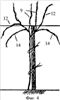 В пятую вегетацию (фиг.5) и последующие годы принципиальный характер обрезки не меняется. Отплодоносившие стрелки (11) и (13) удаляют, а из побегов на сучках замещения (10) образуют новый сучок замещения и новые стрелки плодоношения в соответствии с их назначением.