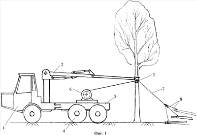 Машина лесозаготовительная в составе энергетического модуля 1 и технологического модуля с лебедкой 6 заезжает по магистральному волоку к очередной пасеке с поваленными деревьями (хлыстами) или с небольшими пачками, приготовленными валочно-пакетирующей машиной, оператор, управляя манипулятором 2, устанавливает на дереве-мачте отклоняющий блок 3, через который пропущен грузонесущий канат 7, который растаскивается по пасечному волоку до места формирования пачки деревьев (хлыстов). Затем чокерами 8 чокеруются поваленные деревья (хлысты); включается установленная на технологическом модуле 5 лебедка 6 на наматывание грузонесущего каната 7, деревья (хлысты) формируются в пачки и подтрелевываются к магистральному волоку, где их отцепляют и оставляют пачку. Далее цикл повторяется до тех пор, пока не будут подтрелеваны к магистральному волоку все деревья или небольшие пачки с пасеки на длину грузонесущего каната 7. После окончания трелевки всех деревьев с пасеки машина лесозаготовительная переезжает к другой пасеке и цикл подтрелевки повторяется вышеописанным способом до тех пор, пока не будет подтрелевана вся древесина с пасек, примыкающих к магистральному волоку. Далее в соответствии с технологическим процессом деревья могут очищаться от сучьев, а хлысты раскряжевываться любым из известных способов. В это время машина лесозаготовительная меняет технологические модули на верхнем складе. В дальнейшем сортименты грузятся грейферным захватом в устройство 11, а деревья (хлысты) в кониково-зажимное устройство 12 и транспортируются на верхний склад (лесопогрузочный пункт).