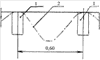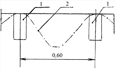 На чертеже изображено поперечное сечение временных поливных борозд для предпосевного полива 1 с междурядьем 0,60 м и контур глубокой поливной борозды для вегетационных поливов 2, нарезаемый перед первым вегетационным поливом.