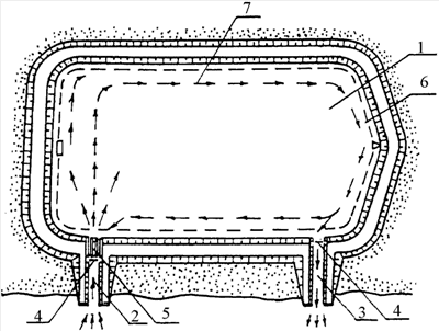 Предлагаемый способ поясняется чертежом, где показан построенный на берегу вырастного озера водоем-спутник (зимовал) 1, соединенный с озером водозаборным 2 и водосбросным 3 каналами, снабженными шандорными перегородками 4. В водозаборном канале расположен аэратор-потокообразователь 5. Позицией 6 обозначена неводная тоня, а поз.7 – направление течения, создаваемое аэратором-потокообразователем.